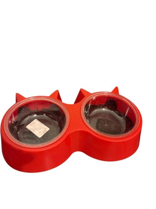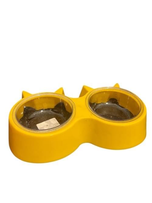 وعاء مزدوج مائل للطعام والماء مخصص للحيوانات الأليفة، ويتميز بتصميم على شكل رأس قطة.