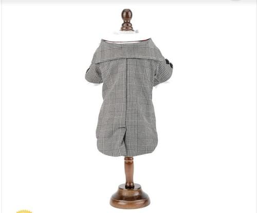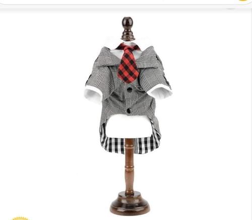 An elegant and formal dog suit, perfect for special occasions and celebrations. It features a classic tuxedo-like design with a checkered red tie, giving your pet a charming and distinguished look. Made from comfortable, high-quality fabric that provides both warmth and style.