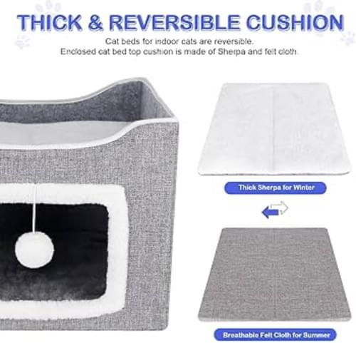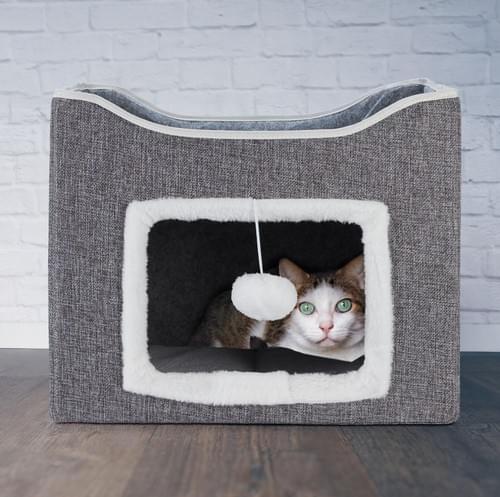 بيت قطط قابل للطي باللون الرمادي، ويحتوي على كهف مغلق للاختباء، وكرة لعبة متدلية، ومنصة علوية للاسترخاء